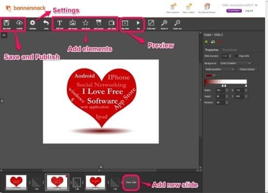 BannerSnack is another free banner making online service that lets you create animated banners, flash banners, and other flash contents without much effort. It offers you 19 banner sizes, 86 templates, 40 above font faces, and multiple transition effects. This free app also facilitates you to customize the size of the banner. It lets you view the preview of the template so as to make an appropriate selection to create flash content. It allows you to add text, slides, image, video, clipart, and various other elements. This free banner making app also lets you set the duration of transition. It allows you to play and view the preview of the flash content created by you. The most convenient feature of this banner making app is that it lets you publish your banner image or other flash content on your website, blog or forum, by single click. Not only that you can easily download the animated flash banner image from the website, but after publishing.