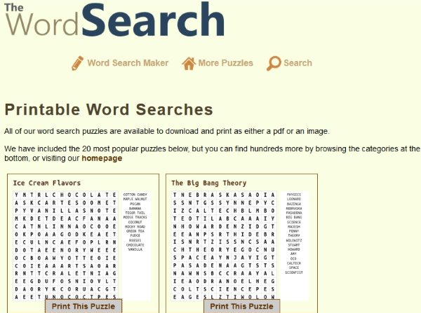 The Word Search is a website dedicated to word search games. You can see its home page in the screenshot above. The website has hundreds of word search games available. The 20 most popular ones are displayed on its home page with a print this puzzle button of each of them. Rest of the puzzles can be browsed through given categories. When you click on a puzzle it will open up in printable page like the one shown in the screenshot below.