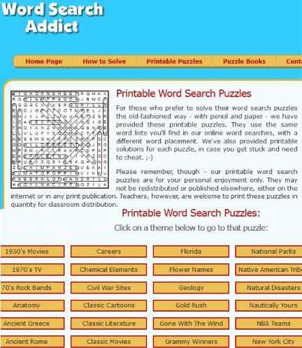 Word Search Addict is nice website with lots of word search games. The home page of the website looks like the above screenshot. The home page has lots of puzzle categories listed. You can browse through the categories and choose the one you want to print. When you click on a category it will open up in full page, like the screenshot below.