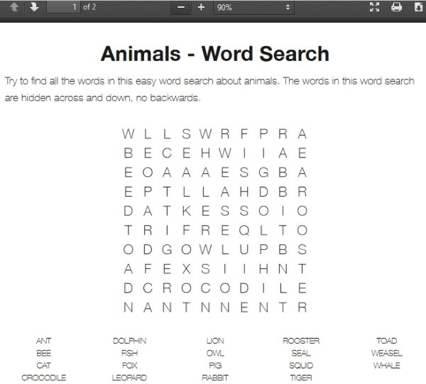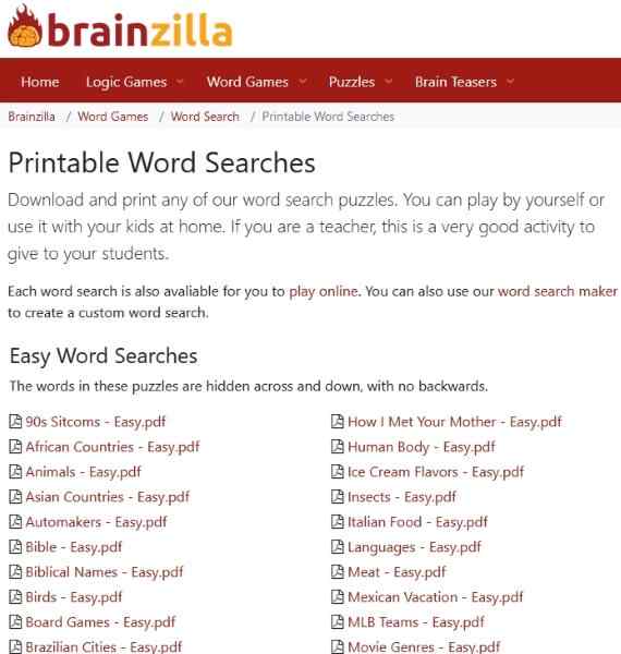Brainzilla is a great website with lots of word search games. The website provides word search games with three difficulty levels which are easy, medium, and hard. All the puzzles are available in PDF file format. You can browse through the puzzles and select the one you want. When you click on the puzzle it will open up the PDF file, as can be seen in the screenshot below.