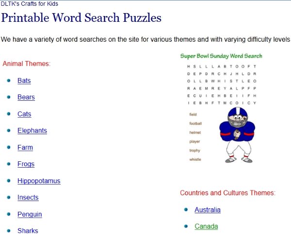 DLTK Kids also has lots of word search games. The home page of the website shows all the games listed category wise. You can browse through these categories and choose a category you like. When you choose a category the puzzle in it will open up in full page, as shown in the screenshot below.