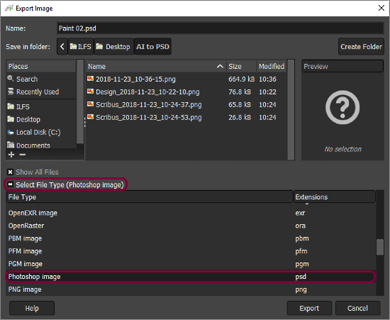 When you import an AI file, this software asks whether you want to open the document pages as layers or as images. It also gives you options to change the document dimensions and resolution. After opening the file, you can export it as PSD from File -> Export As. In the export window, you can browse the format options by clicking on the Select File Type box. This gives you a list of all the supported file formats to which you can export the content of the AI file. Select the PSD format from that list and click “Export” button to save the AI file as PSD file.