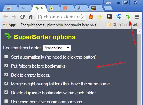 To setup a bookmark optimization job with SuperSorter you just need to open up its setting, put check marks next to the tweaks that you want to see applied and after that just click on the top right corner icon. It’s also possible to setup automatic bookmark optimizations, which will run every X number of minutes.