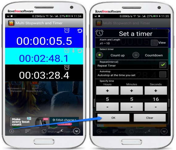 To create a new timer in this app, tap on the “+” button and then tap on the timer. After that, select the Timer option from the pop-up menu. You will now see a pop-up screen on which you can specify the timer duration and other timer related options like repeat timer, auto-stop at the specified time, and whether you want to the timer to count up or down. It lets you set the default ringtones of your phone as the timer alert tone. Another good feature of this app is that it supports multiple languages like Spanish, Arabic, English, French, Italian, Japanese, and many other foreign languages.