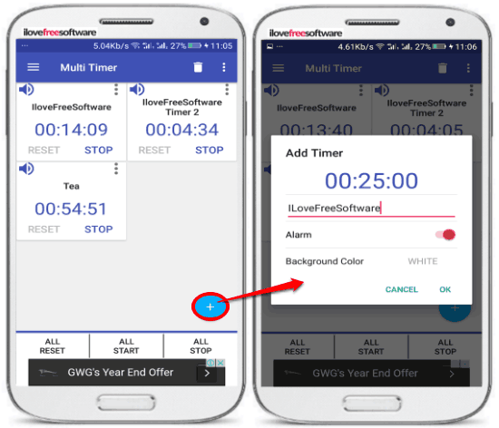 Multi Timer- Stopwatch Timer is another free multi timer app for Android. With this app, you can set a timer up to 999 hours 23 hours 59 minutes. You can also add a title to a timer and choose to play the alarm after the timer runs out. To add a timer, tap on the “+” button and then specify the duration of the timer. Tap on the OK button and the timer will be created and added to its main screen, as shown in the screenshot above. After that, you have to tap on the START button to start a timer. Similarly, you can add multiple timers to run concurrently. You can also start all of the added timers at once. Simply, tap on the ALL START button to start all the timers concurrently. There are a couple of options more by which you can control all timers. You can choose to reset all timers and stop all timers with just a tap on “ALL RESET” and “ALL STOP” button. Similar to the other multi timer apps on my list, the timers of this app also remain active even if you close the app.