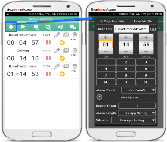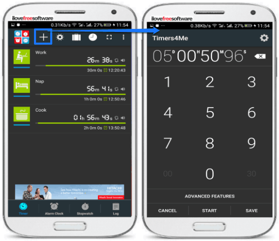 Multi Timer StopWatch is another free multi timer app for Android. From this app, you can also concurrently run multiple stopwatches. This feature is found missing in the previous multi timer Android app. It lets you set multiple timers in hours-minutes-seconds format and up to 999 hours (approx. 41 days). Just like the previous timer app, the timer of this app also remains active in the background. Another exciting feature of this app is that from it you can set a timer within a timer. In simpler words, you can set a time interval within a timer after which the app will alert you. You can also set the different notifications ringtones for different timers. It lets you select a ringtone from the default ringtones of the phone or you can even use its text-to-speech feature.