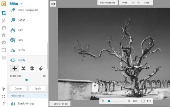 As you open this editor, you will be asked to upload your photo. After uploading, go to Distort tab. Here, you will find the Liquify options. Select one, then you will get options to select brush size and strength. After setting up the brush, begin applying the effect. When done, save photo to your PC.