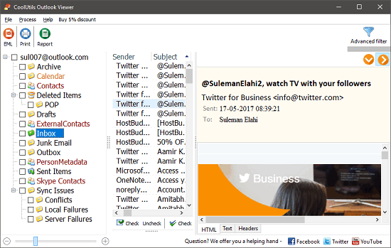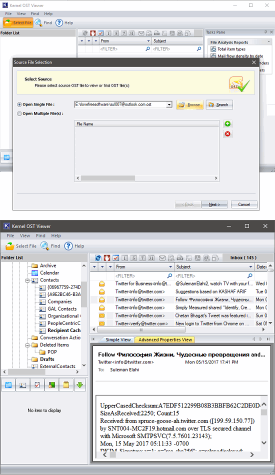 Kernel OST Viewer (homepage) is a very good OST viewer for Windows. It lets you view a healthy as well as corrupted OST file and view its contents. You can easily see what data is actually in an OST file and view it on the interface of the software. The software shows the stored emails and other information. And it sketches a tree like structure on the left side of its interface where you can see the content of the OST file, including emails, contacts, notes, journal, etc. However, in the free version of the software, you cannot export the results to any file.