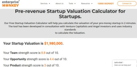 Enterprise Monkey calculates your company’s pre money valuation easily. When you reach the website you will have to answer a couple of questions. This questions tool is based on industry standards and made in guidance from investors, venture capitalists, etc. Once you are done answering the questions, you will be asked to provide an email address so that your result can be emailed to you. You will also be shown the results on the website once you submit your email address.