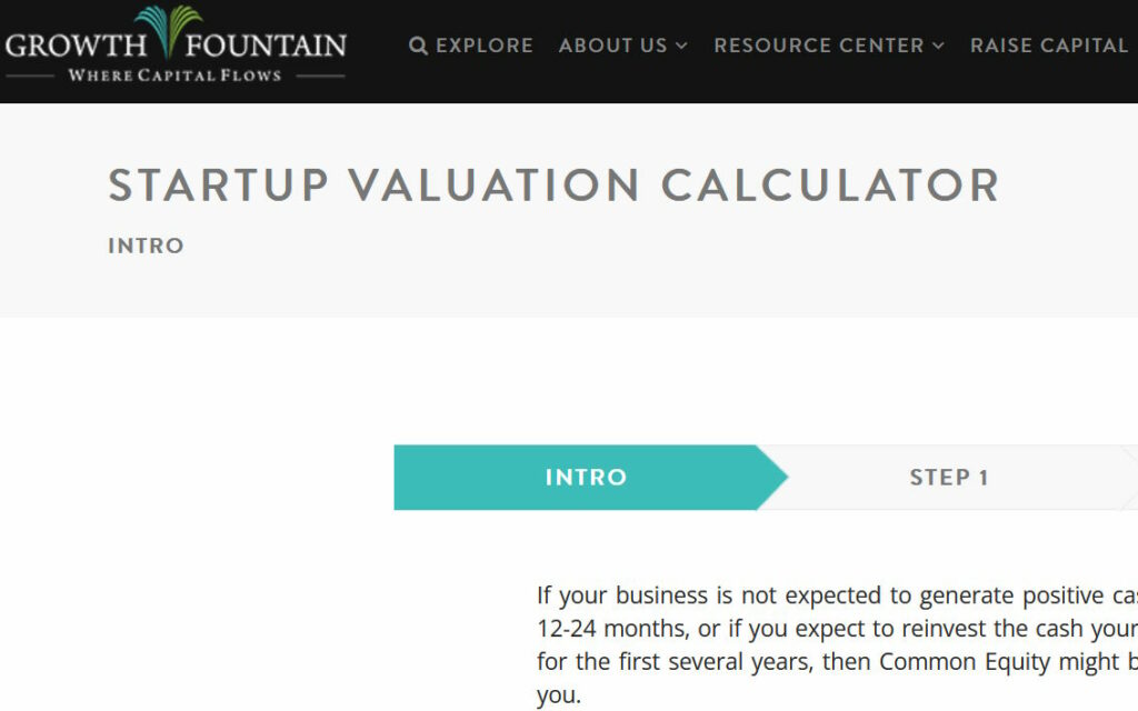 Growth Fountain also gives you a pre money calculator for your startup. When you reach the page of this calculator it will look like the screenshot below. At the bottom of the page you will find a get started button to move ahead.