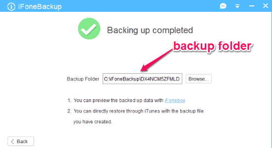 Step 3: Once the backup is complete, it will show the “Backup Folder” location where the new backup is created. You can now use iTunes or other similar software to restore the data by importing the backup file from the folder location. The main purpose of this software is to backup iPhone data to PC and it doesn’t have any built-in option to restore data.