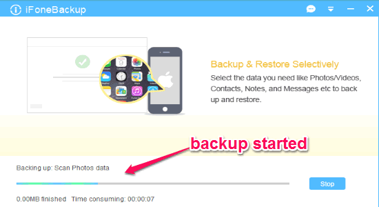 iFoneBackup is a simple iPhone data backup software which can be used to backup videos, photos, contacts, notes, apps, etc. The best part of this software is that the backup files generated with iFoneBackup can be restored using other software also (such as iTunes and iTunes alternatives). Simply follow the steps below to backup your iPhone data to PC.