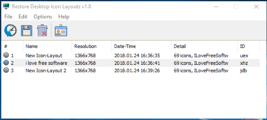 IconRestorer is another handy software to save desktop layout in Windows 10. Just like above mentioned software, it also lets you save multiple desktop layouts, one after another with a custom name. After that, you can use “Layouts” tab available on its interface to restore a particular desktop icon layout. You will be able to save the layout name, date and time, and screen resolution related to each desktop icon layout.