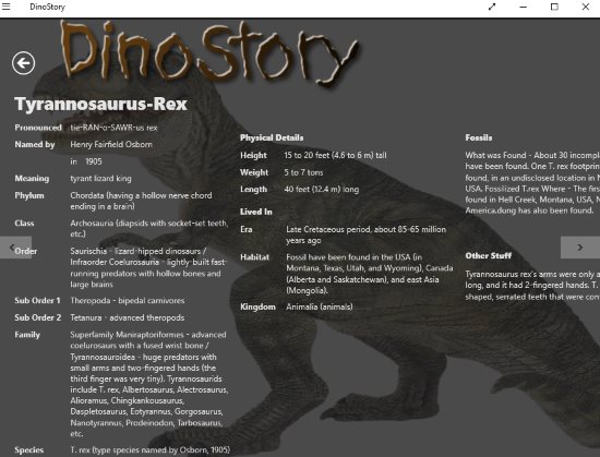 DinoStory is a nice dinosaur app with lots of information, and facts about dinosaurs. You can see the home page of the app in the screenshot above, here all the dinosaur species are listed with images and their names. You can scroll through them easily. To know more details about each type of dinosaur just click on the image. A page like the one shown in the below screenshot will open up with description of the dinosaur that you selected.