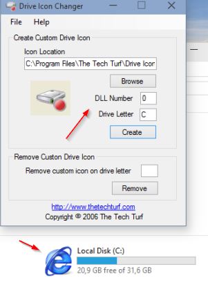 Install the app, run it, and it will offer you two options to tweak. First you need to select the icon (ICO) file with which you want the replace the default drive icons and after that the drive letter for which you want to change the icon. Click Create will apply the changes, see image above.