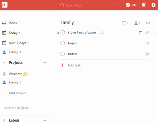 Todoist is one of the popular websites to create and manage work related or personal to do lists. This is also a good platform to create family to do lists. You can create different projects or family to do lists and then add tasks to those lists. Family members or collaborators and you can easily create and edit tasks, set due date for a task, and mark tasks as completed. You can also assign a task to a family member and filter tasks by name, date, priority, etc.