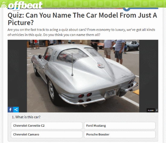 OffBeat is an entertainment-focused website full of quirky stuff. It also has different types of quizzes covering various topics. There is a car quiz where it asks users to name the car model from just a picture. This quiz features 44 questions where it shows you a picture of a car and you have to choose its model name from the given four options. Initially, it only shows you 12 questions, as you finish those another 12 questions are added to the quiz until you reach the last question. When you submit the quiz, it gives you a percentage score in the results.