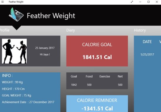 Feather Weight lets you track your calories and exercise for each day. The app when started will ask you some basic questions like your height, weight, gender, age, activity status, etc. Then you will be asked to select a goal weight and how much weight you want to loose in a week. After entering all this information, you will be shown you daily calorie goal, by what time you will be able to reach your goal weight if you keep up with this calorie goal, etc. The screenshot above shows the interface of the app after you have answered all the questions and selected a goal for yourself. The calorie goal is displayed at the center of the screen in red colored box. Below this you can enter your food and exercise data for the whole day. The right side of the app will display your day wise history. You can keep track if you have been able to keep your calorie intake with in the goal or not. Left side of the app displays your info, and your goal.