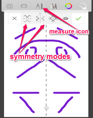 Step 4: On the toolbar, you will be able to see a “Measure” icon where you will be able to add text, insert images, add shapes, and most importantly use the symmetry drawing tool. Simply tap the icon and select the ‘Symmetry” option. It provides three different modes i.e; horizontal, vertical, and stop/extend strokes at the line of symmetry. Simply select a mode and start drawing on one side of the dotted line that appears on the canvas. Whatever you draw on one side of the line will be automatically drawn on the other side.