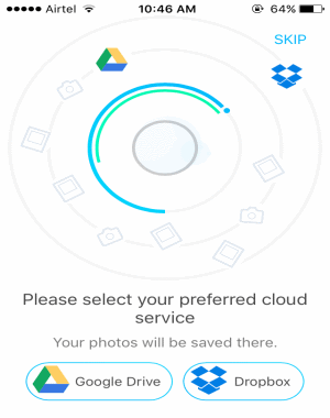 Step 1: As soon as you open the app, it will ask you to select your preferred cloud service either as Dropbox or Google Drive for uploading original photos. To connect a cloud service, tap on “Google Drive” or “Dropbox” button and enter credentials to connect your account.