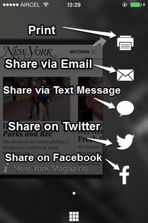 To do that, all you have to do is open the recently visited pages switcher view, and tap the curved arrow icon on the top right corner of a page you want to share. Once you do that, specific (and self explanatory) icons appear that let you either message or email the page to someone, or share it over Social Networks. Check out the screenshot below: