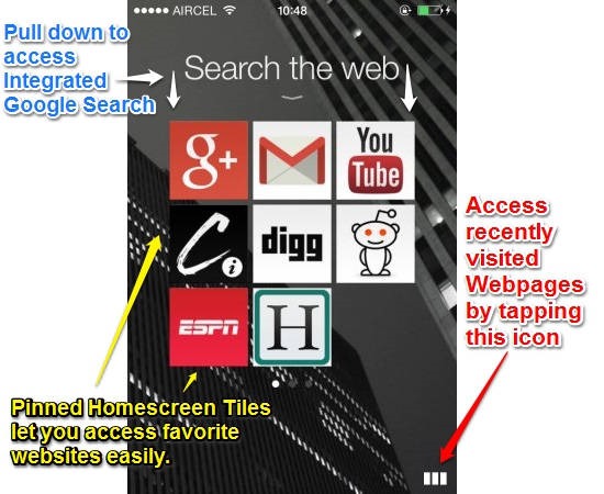 As illustrated by the above combo screenshot, pulling down reveals a minimal search UI, which can be used to directly enter search strings using Integrated Google Search. The same field can be also used to enter URLs of websites. Both URLs and search strings reveal real-time visual search results with their icons, which can be then directly tapped to access the desired webpage/website. Pretty cool, if you ask me!