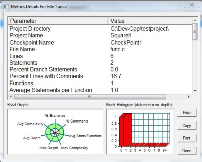 SourceMonitor shows you a pie chart showing you the average complexity, statements and functions and the percentage of comments. The Bar Graph shows you the statements vs. depth. As you know, comments are one of the most important aspects of programming when it comes to the readability of your source code. You, as a Project Manager, can set standards for the percentage of comments, number of statements and function etc., in a source code, and quickly analyze the code once they’re submitted to you by just looking at the chart. You can copy this data on to any text editor and forward it further for analyses. This also lets you print out the data if you wish to.