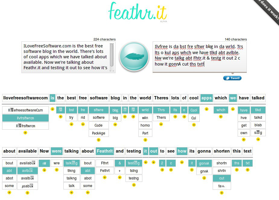Feathr.it makes it easy for people to make their tweets acceptable to the Twitter’s 140 character rule. Everything is done automatically and you even get various different suggestions for the shortened text. Make sure to give it a try, it’s free and online, you just need your browser to use Feathr.it.