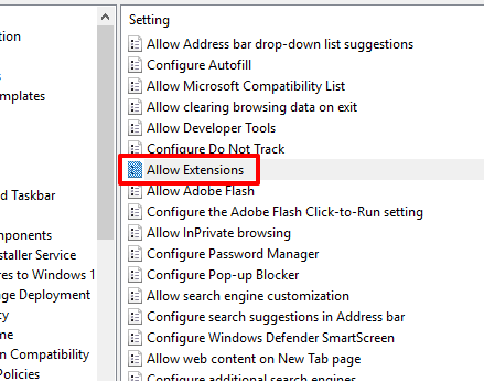 Step 3: When you have accessed Microsoft Edge folder, a list of options will be visible. In that list, find “Allow Extensions” option, and double-click that option.