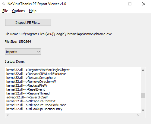 Step 2: Use the “Inspect PE File” button to locate an EXE file that you want to analyze for function imports. After that, the software will show the list of functions. And corresponding to the function name, you will see the name of the library.