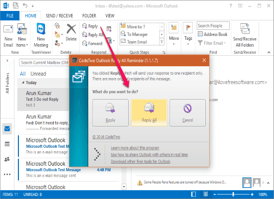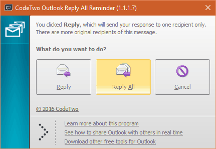 CodeTwo is a free plugin for Microsoft Outlook that reminds you to “Reply to All” whenever you reply to an email that has multiple recipients. When you click on “Reply” button, it will show a dialog box and will remind you that you might want to click on “Reply to All” instead. The best part of this plugin is that it does not come up when you click on Reply on an email which has just one recipient. So, it works pretty intelligently.
