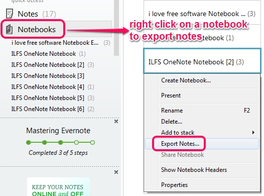 This option is useful if you have to backup only a particular notebook with all notes. For this, click on Notebooks option available just below Notes option. Clicking on that option will show you list of all notebooks on right side. Now, simply select a notebook, and right-click on it. It will provide you same Export notes option.