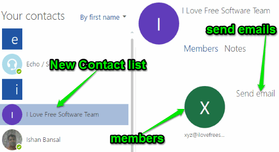 Step 3: After you’re done with creating a contact list and adding members, simply hit “Save” and the newly created list will be visible on the “Your Contacts” panel, as you can see in the below image. When you click on the contact list, the other panel on the right will pop up two different tabs named, Members and Notes. On the “Members” tab, you will be able to see all the added members and also click on any user to schedule a meeting using Outlook Calendar or send an email.