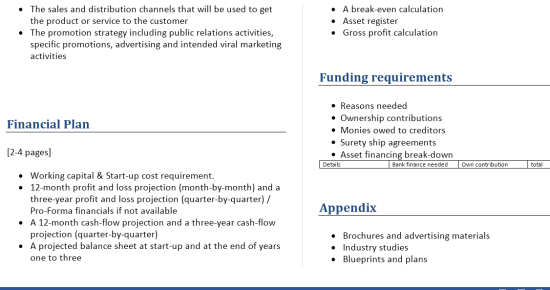 The next website in the list is Enterprise-Ireland. It provides the business plan template in Word format. The template is free to download and consists of 10 sections including Confidentiality Agreement and Appendices. The sections are the commonly found ones like Company description, Market analysis, Research & development, Staffing & operations, Financial projections, etc.. There are bullet points in each of the sections for your better understanding of what to expect and what to write.