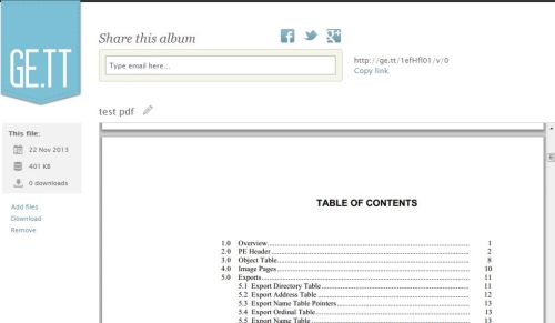 Ge.tt has a simple and easy to use interface. However, it does not have the feature to create folders. This might be a problem if you intend to upload many files. However, Ge.tt displays the files as a list if you have a lot of them. Though the storage size is low, still it is a decent online pdf viewer and can come handy when you quickly want to share some files or view a pdf without signing up.
