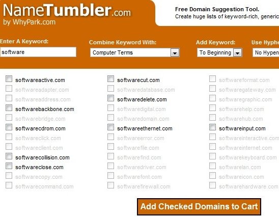 NameTumbler is a free domain suggestion tool that helps you finding a domain name related to the keyword that you have in mind. For example, if you want to register a domain name with keyword “software” in it, then this free domain name suggestion tool will help you do that. It will give various names that contain the word “software”. For each domain name, it will also tell whether the domain is already registered or not. In case the domain is not registered, it lets you register that domain name right there.
