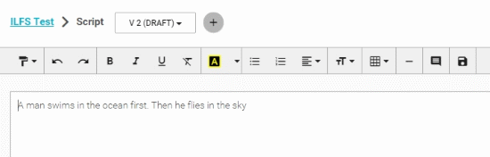 Click on Script to add a video script. It will turn Red to tell you that it has been added. The script will provide you a simple text processing workspace where you can write the script of the video you want to produce. Like the usual text processors, you can change the paragraph style, change the text color, add bullet points, add tables, etc.