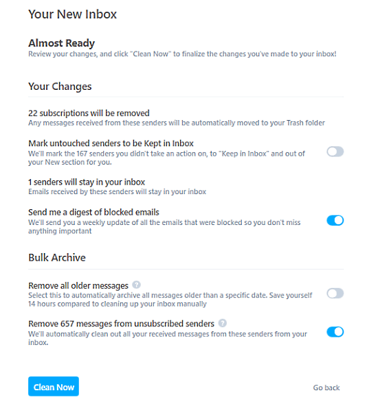 You can select these options as per your liking. But if you want to clean your inbox, do select the option to remove teh total selected message from the unsubscribed senders. After that, click the “Clean Now” button to unsubscribe from the unwanted emails and remove them from your inbox.
