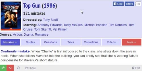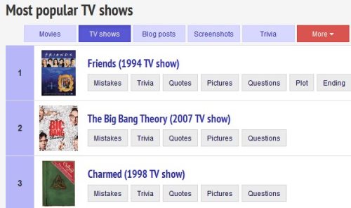 Popular: As expected, the popular menu contains the most popular TV show and movie mistakes. When you click on either TV shows or movies you will be shown a long list of the listed TV shows or movies. Under the name of each will be buttons for mistakes, pictures, trivia, quotes, questions, etc.