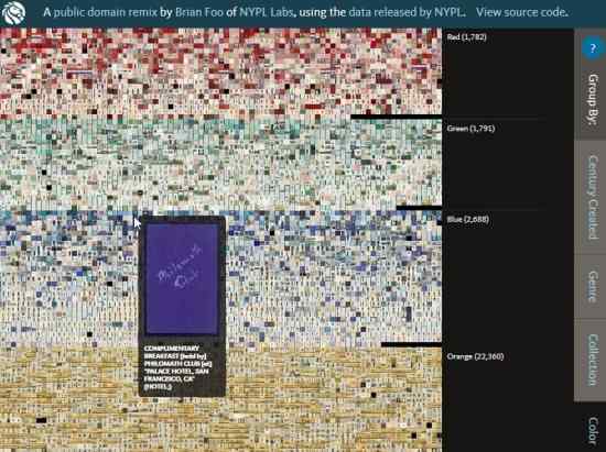 Here a visual has been created using thumbnails of digitized items from the public domain. This visual gives you the option to sort it by century, by collection, by genre and even by color. When you hover your mouse over a thumbnail, a visual will come up with a small description.