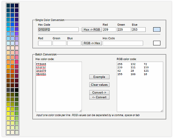 The second section lets you batch convert color codes. Here, you can carry out two way conversion. You can either batch convert Hex to RGB or batch convert RGB to Hex.