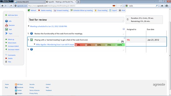 One of the cool things about the AgreeDo platform that I did like was the timer. When you create the meeting and invite people to it, you can specify both a start and a stop time. But, every time I refreshed the page to see who had come or gone, the timer shut down and reset.