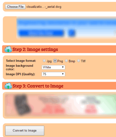 Another handy website for DWG file conversion is Dwg to Jpg. Unlike its name, it can convert DWG to BMP, TIFF, and PNG. Unique feature of this website is that you can set image background color and image quality for output. Different colors and quality levels are available to change background color and set image quality.