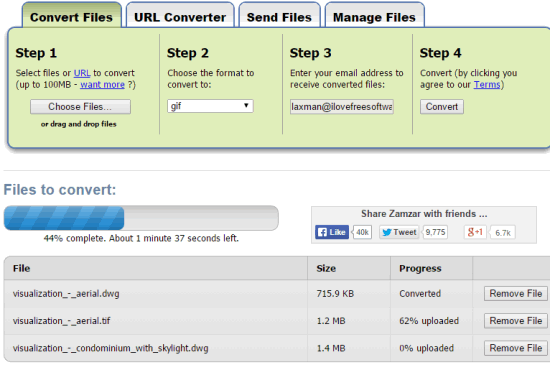 Zamzar is one of the popular online file converter websites that also supports DWG format for conversion. It lets you bulk upload files (up to 100 MB) and converts those files to many possible output formats. For DWG files, it can provide output as PDF, GIF, JPG, TIFF, PNG, and BMP. Apart from converting files stored on your PC, it also lets you convert online files.