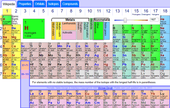 Ptable is a free online periodic table with element properties, electrons, orbitals. This is very useful and intuitive online Periodic table that you have ever used. It has covered all the features of the modern periodic table that a highschool student can learn easily. Just like other periodic tables of its kind, it shows the basic information about the elements. But what sets it apart is its ability to show the physical properties of elements at specific temperature, its electronic configuration in the table itself, the general component chemical compounds of an element, isotopes and other properties. And the best part is that if you want to know more about an element, you just have to click on it. It will open the Wikipedia page of that element on the same page in a frame that won’t obstruct the existing view of the table.
