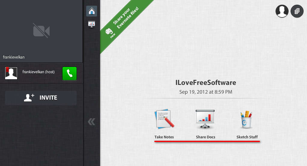 If everyone’s there, use the three icons in the center of the screen to start adding content to the meeting, you can upload files from your computer, share files from Dropbox or Evernote, or you can use the inbuilt scratch pad to develop the ideas that you want to present to your colleagues.