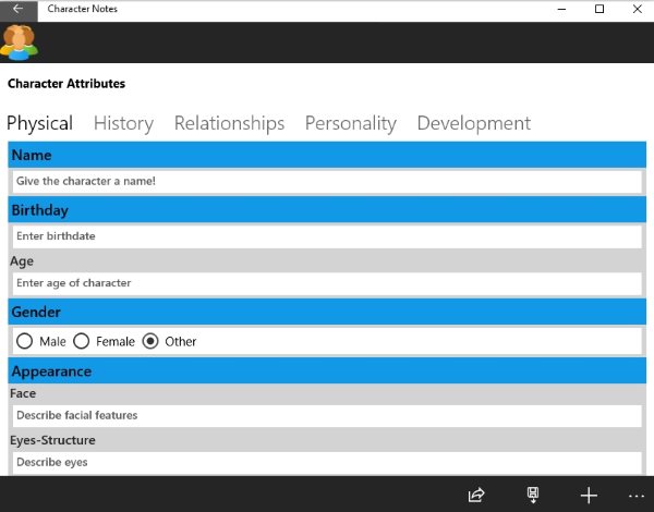 Character Notes is great tool for budding writers or even seasoned authors. Character Notes is a free Windows 10 character development for writers app which helps in developing characters for novels or stories. As a writer you sometime have some idea about a character that you could use in your story. But either you forget when you sit down to write the story, or you don’t remember the entire traits that you thought about a particular character. To handle situations like this you can use the Character Notes app. This app lets you define the traits of a character in your story in a very elaborate manner.