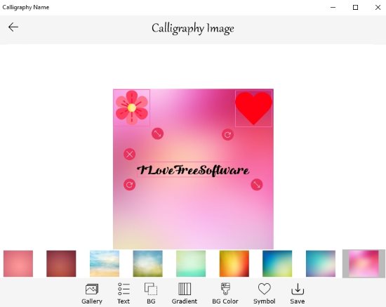 Calligraphy Name is a Windows 10 decorate photos with text app where you can decorate or add beautiful text to your pictures using different styles of text. The app lets you choose a background to decorate with text and you can also choose your own photo from the device gallery to decorate. Apart from different styles of text, you will also get to add stickers, background images, etc.