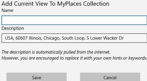 Add to My Places: In case you like a location you see on the map, then you can go ahead and add it to your places. Just give a name to the location which you are seeing right now and click on the save button to save the location. Once saved the location would be available under My Places Collection.