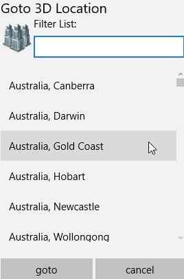 Goto 3D Location: This option lists out all the country and cities which you could visit for a 3D view. All the countries are listed in alphabetical order with the country name first and then the city name. Just select the country and city you would like to see, then click the goto button. This will immediately change your 3D view location to the one chosen by you.